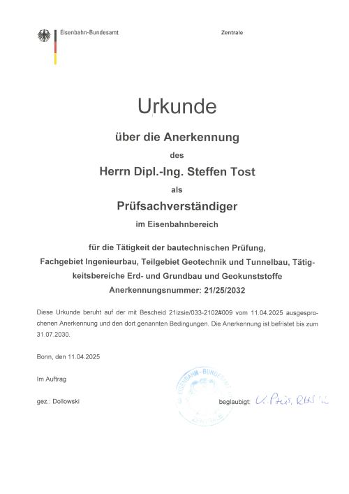 Our Managing Director, Mr. Dipl.-Ing. Steffen Tost, has been officially recognized for the third time since 2010 as an inspection expert in the railway sector. The extension, valid until 2030, covers structural engineering inspections in the field of civil engineering, specifically in geotechnics and tunnel construction with areas of activity including earthworks, foundation engineering, and geosynthetics.